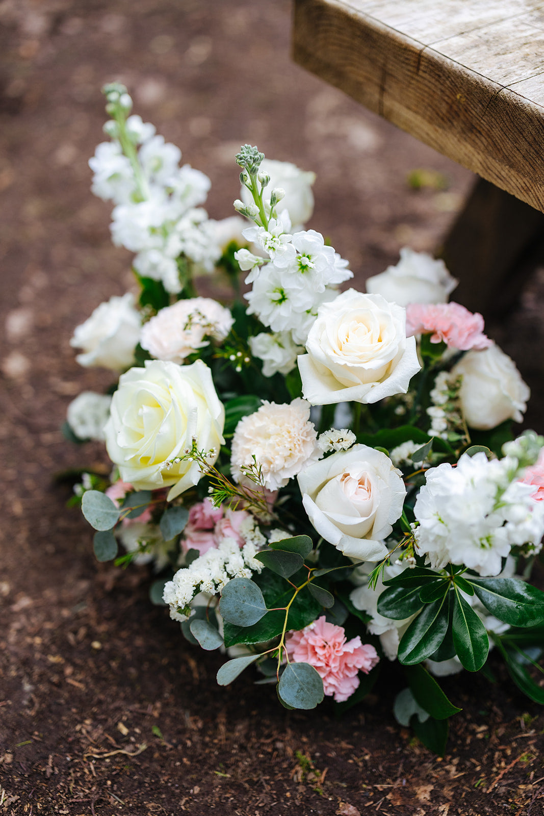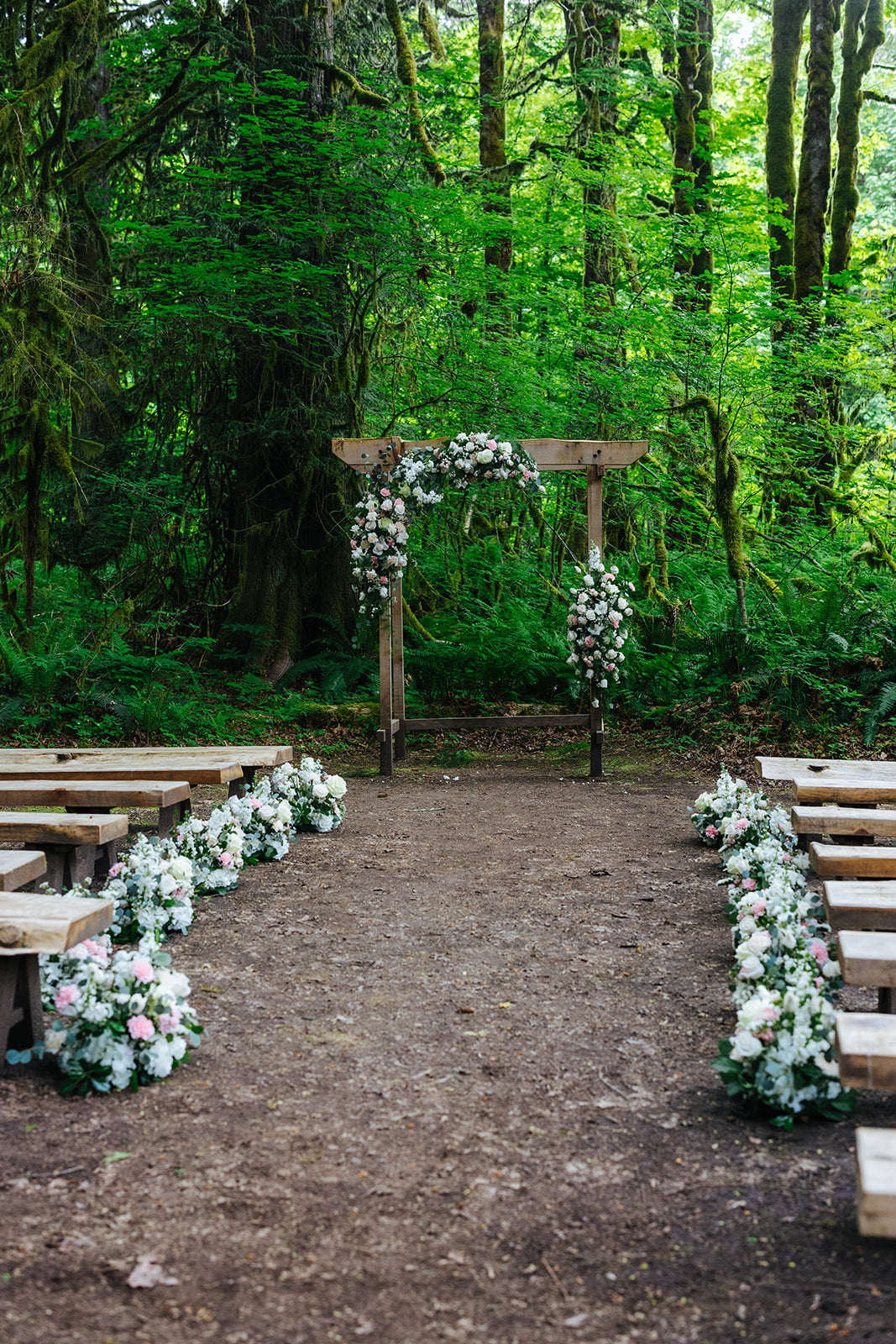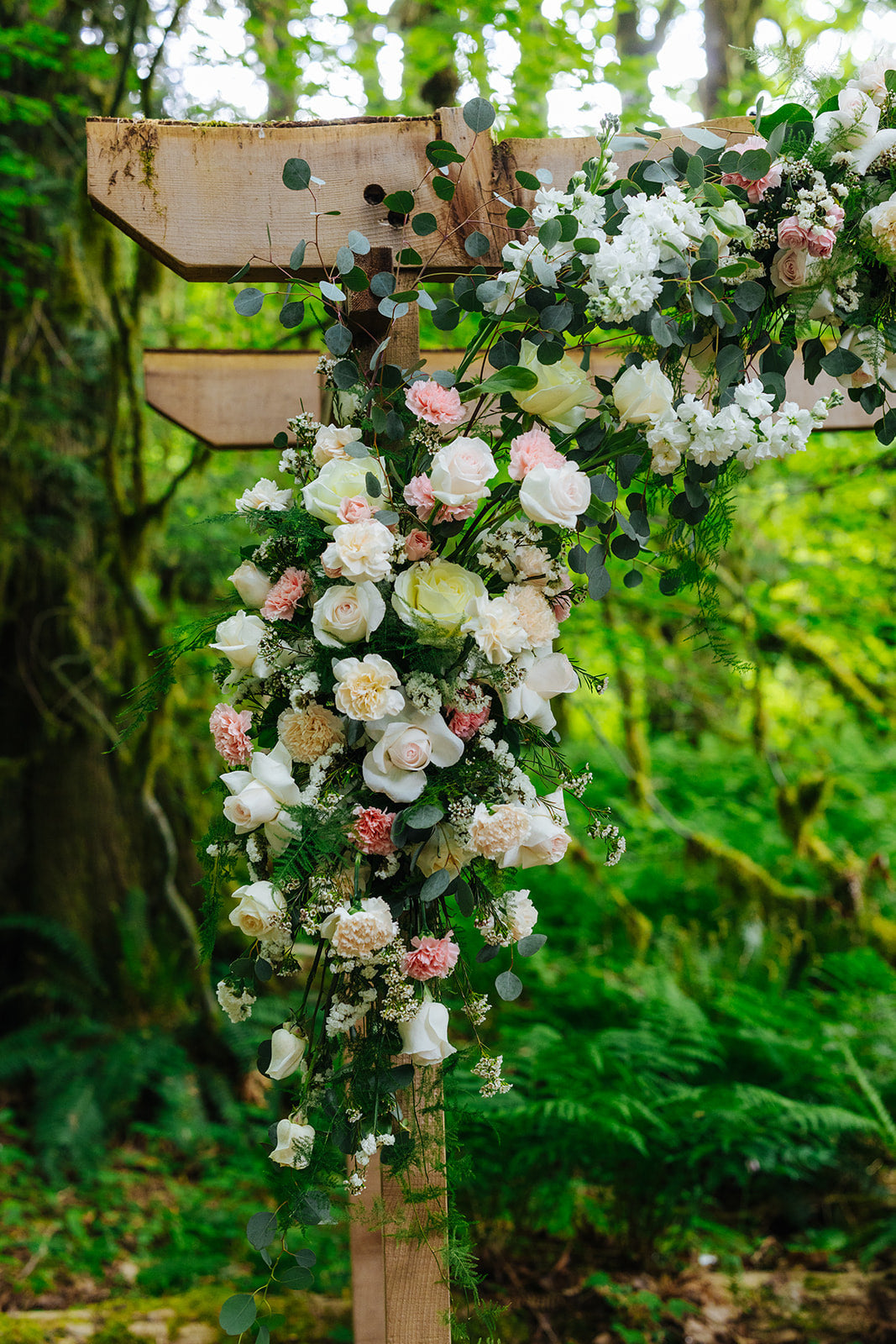 The floral story blended seamlessly with the forest setting, featuring a soft palette of whites, warm beige, delicate blush, and lush greenery. Burst Flowers, a Vancouver wedding florist, designed every detail with elegance and care, including: