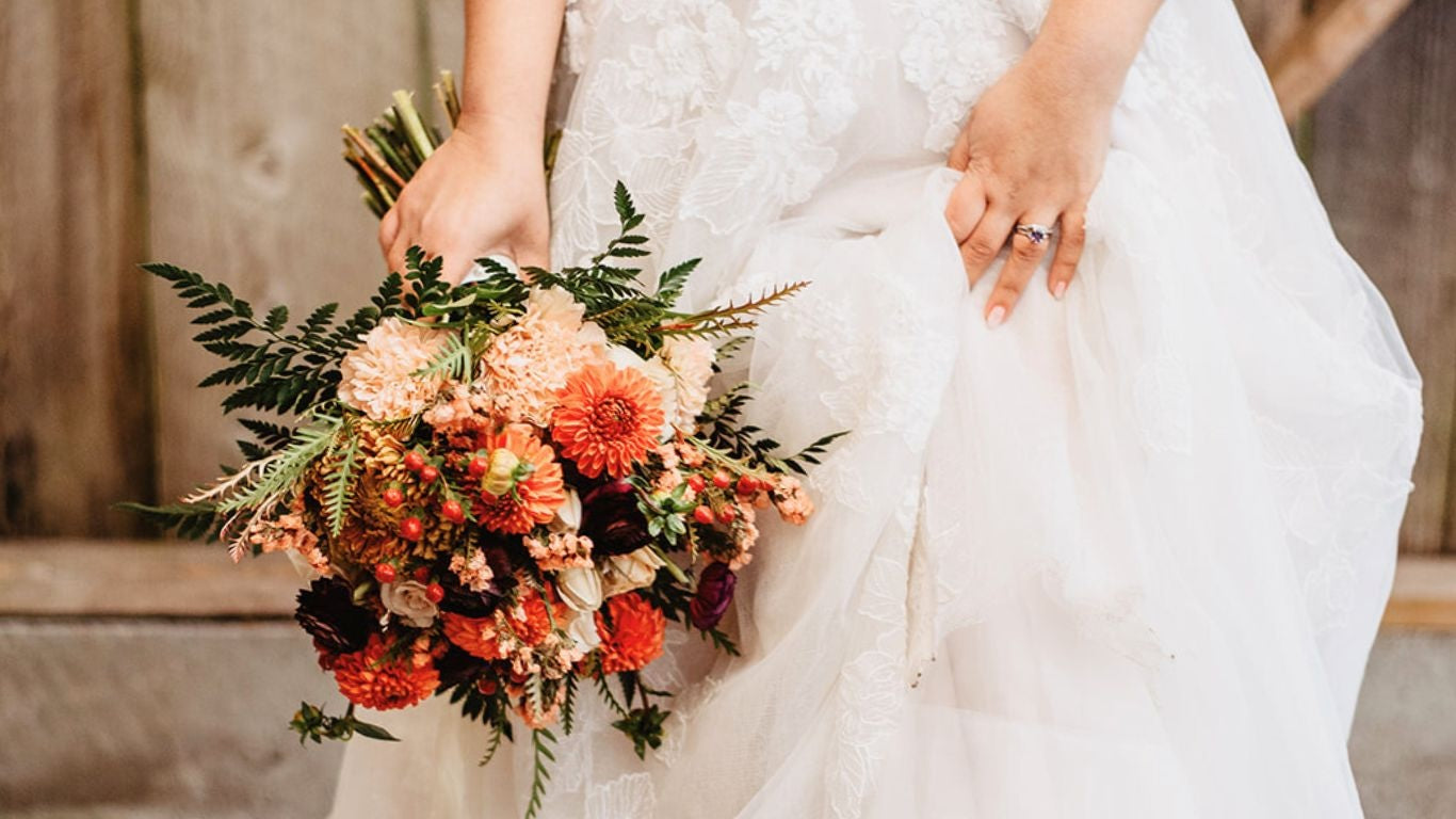 Burst Flowers, a Vancouver wedding florist, designed florals that perfectly reflected the cozy autumnal atmosphere. The color palette featured rich bronze and burgundy tones, accented with beige, copper, and golden mustard, creating a warm, romantic, and inviting setting.