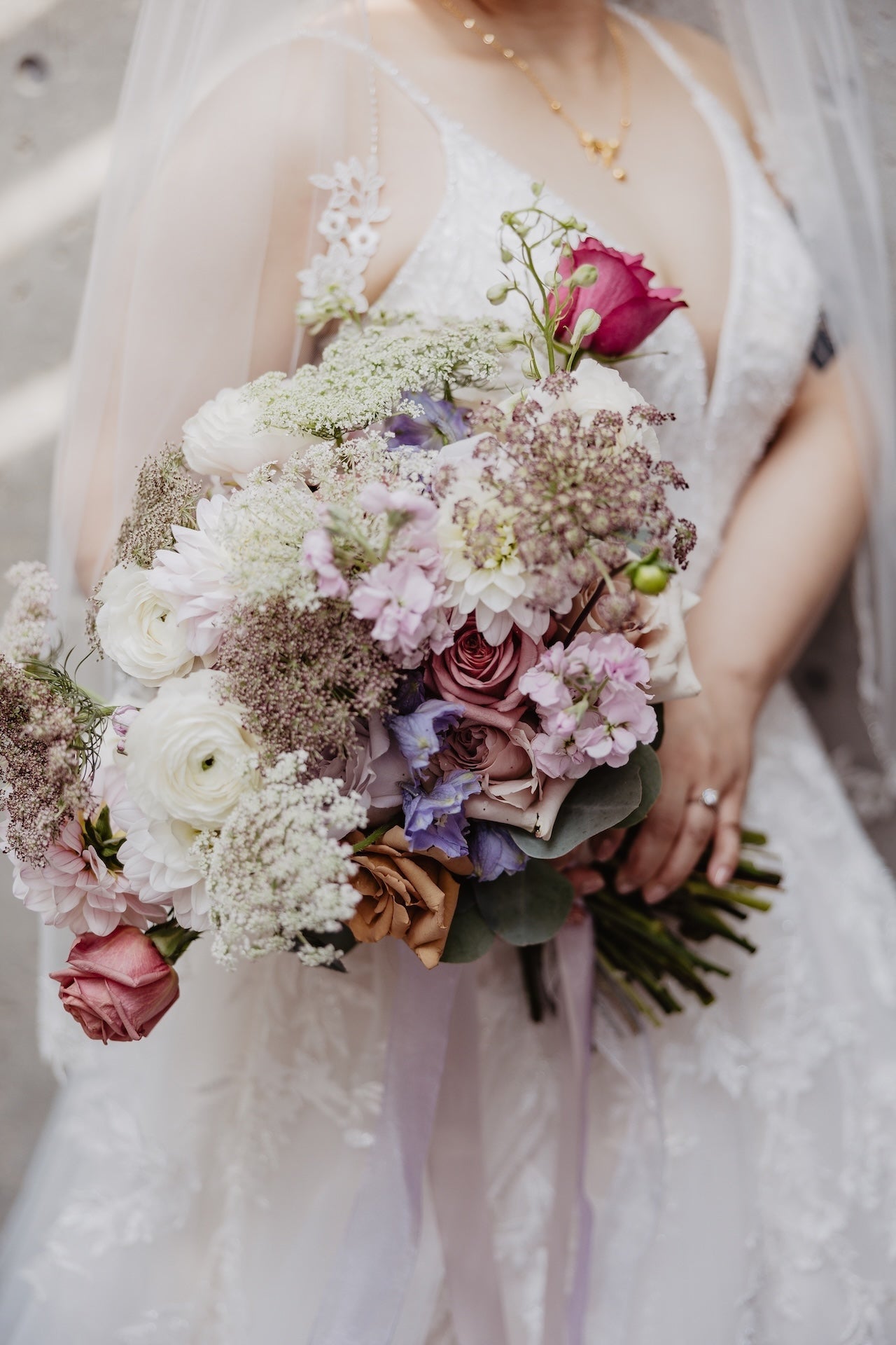 Burst Flowers designed garden-inspired wedding florals that reflected the couple’s relaxed yet romantic vision. Their unique pastel-inspired palette of sangria, oat, lavender, clay, thistle, rose, and fresh greenery brought depth, texture, and elegance to the designs. The result was a dreamy, organic look that tied together the warmth of summer with soft, romantic tones.