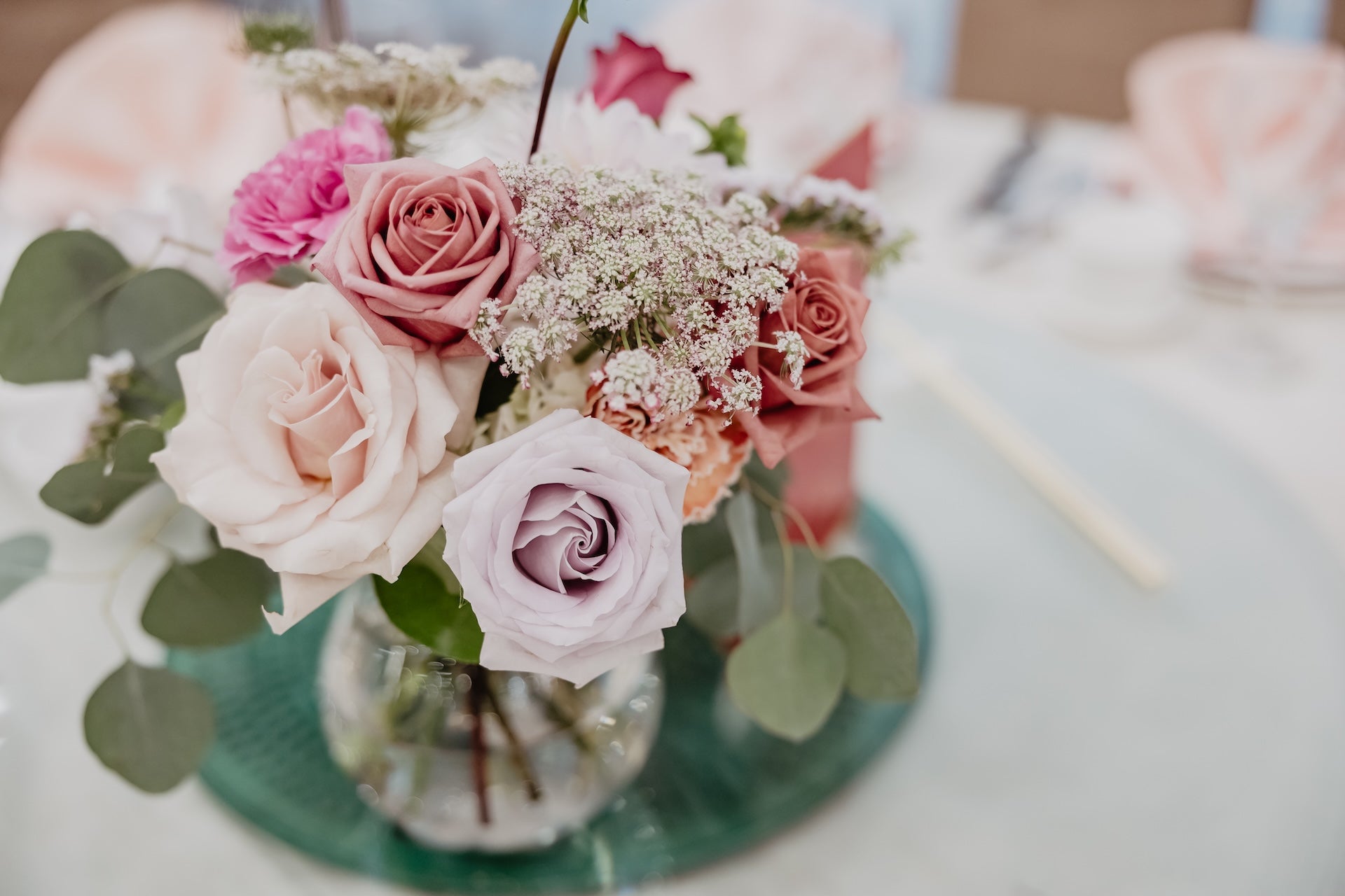 Reception florals at Gingeri Chinese Restaurant – soft, garden-style arrangements creating a warm, inviting atmosphere