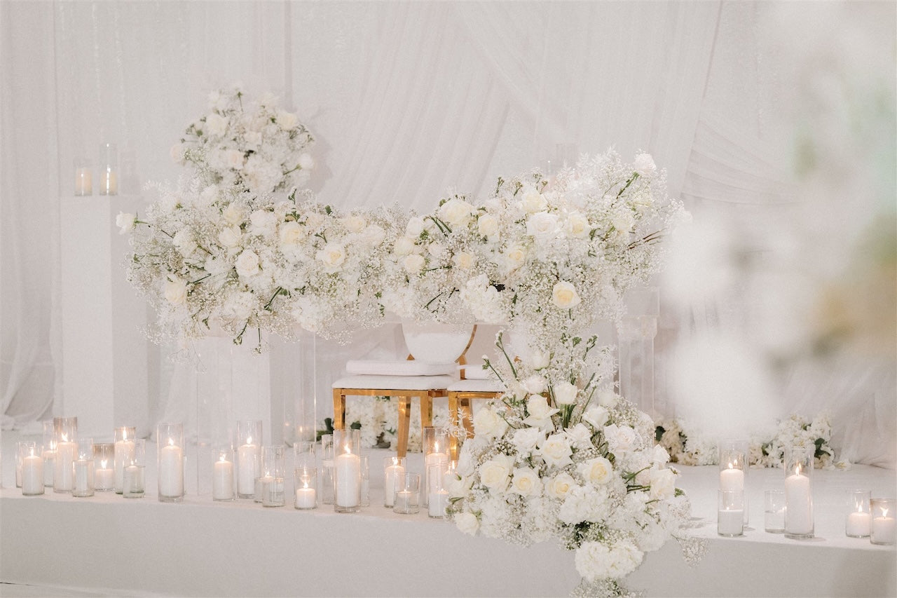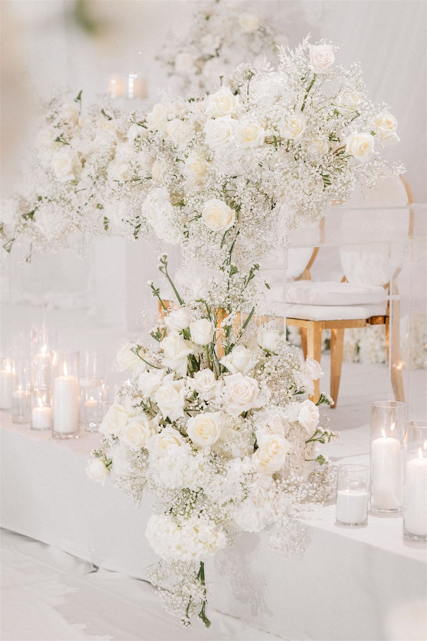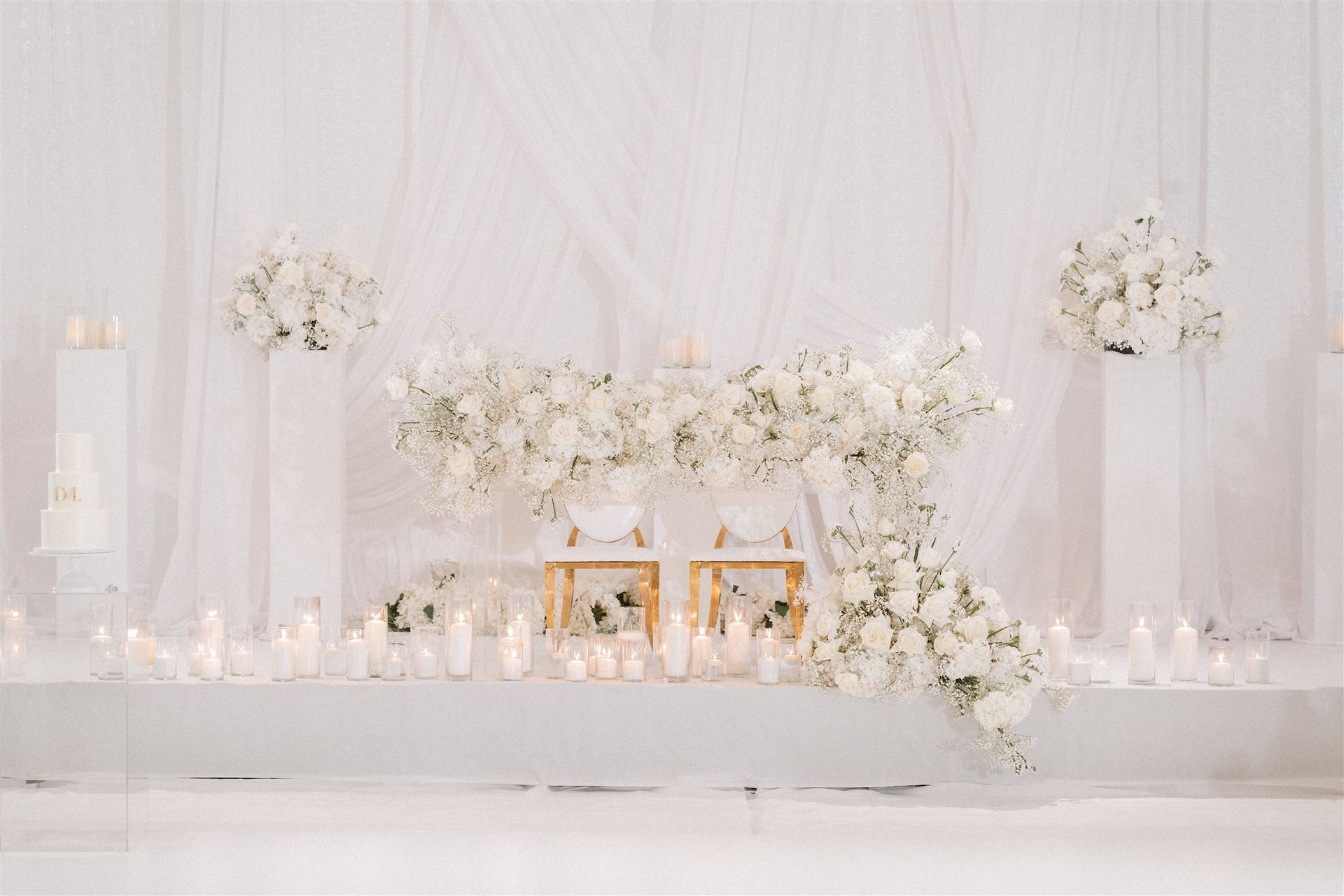 All-white head table floral arrangement – a striking, cohesive design for the reception