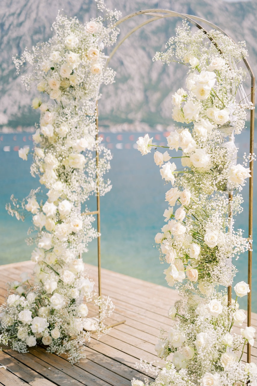 Covered in lush greenery, roses, hydrangeas, or peonies, this type of arch exudes elegance and romance. It’s perfect for garden weddings, beach ceremonies, and ballroom receptions.