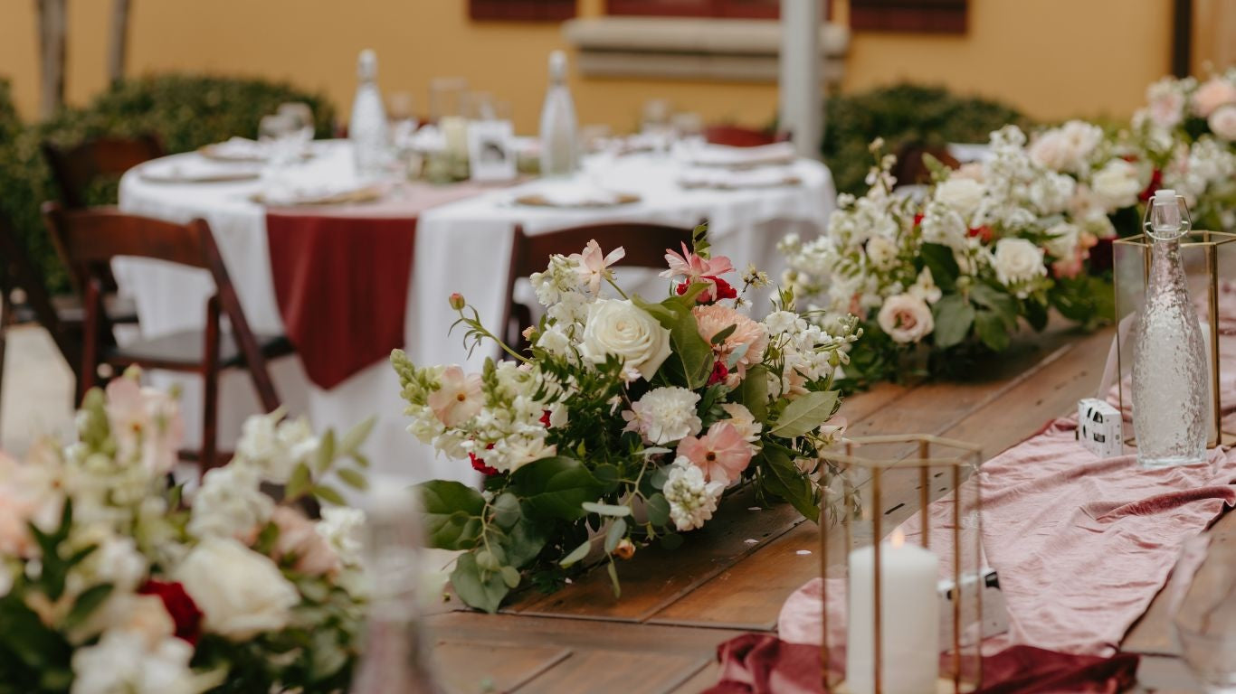 A larger arrangement for the head table, usually more elaborate to suit the main table.